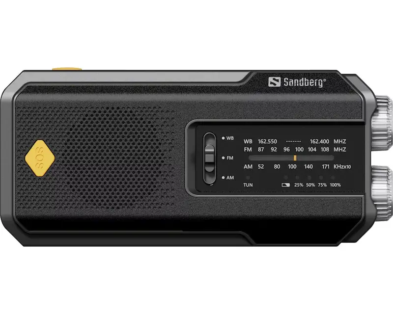 Cette radio d’urgence compacte combine les fonctions essentielles pour rester informé, éclairé et joignable en cas de crise. Elle intègre un tuner AM/FM, une lampe LED de 90 lumens, une batterie interne de 2000 mAh, une dynamo à manivelle, un panneau solaire et une fonction powerbank.